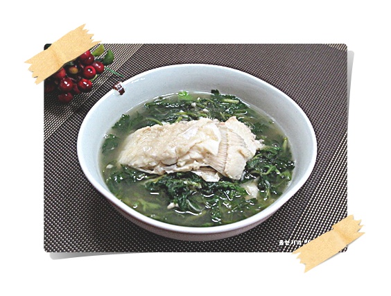 - 도다리가 익고 나면, 씻은 쑥과 송송 썬 대파를 넣고 2~3분만 더 끓입니다.